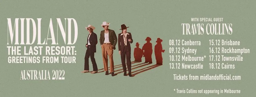 Grammy®-nominated trio MIDLAND will return Down Under in December 2022 as they bring THE LAST RESORT: GREETINGS FROM TOUR to Australia.  The country music superstars will kick off their tour in Canberra on the 8th December before making their way up and down the East Coast of Australia. Tickets on presales start Friday, 6th May, general on sale from Tuesday, 10th May via Midlandofficial.com.